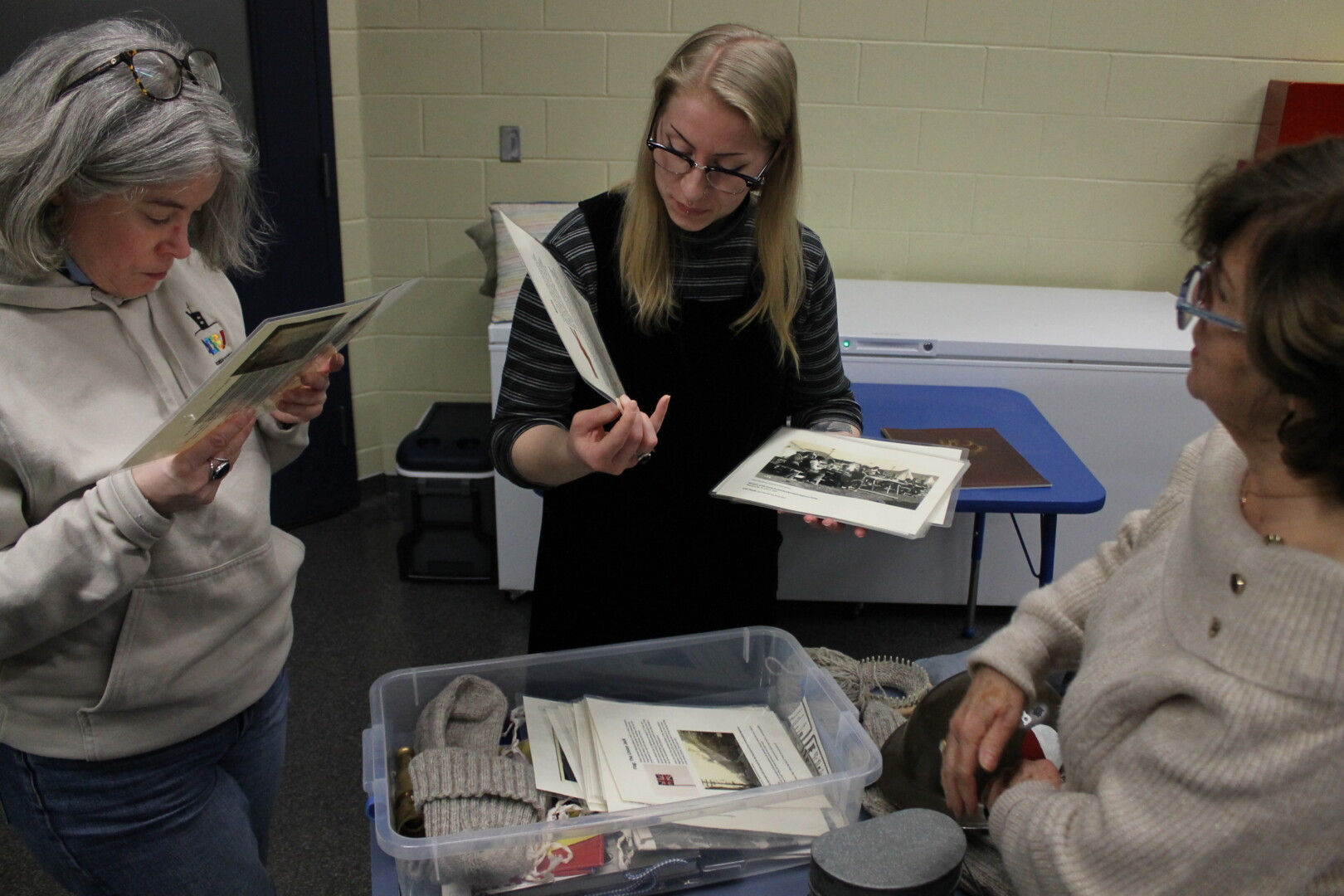 Pour inspiration, Marie-Estelle Joos-Brehamet, Jessica Tucker et Nawal Krouchan apprennent des matériaux utilisés par les soldats et marins pendant la Première Guerre mondiale.