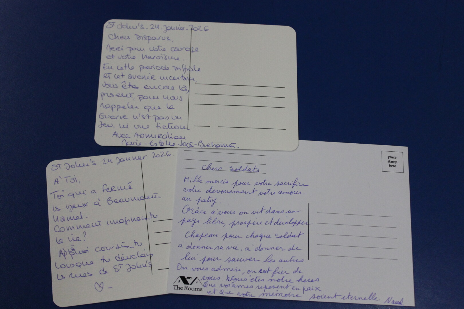 Trois messages sur cartes postales écrites par Marie-Estelle Joos-Brehamet et Nawal Krouchan, remerciant les soldats pour leurs efforts.