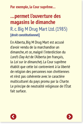 En Alberta, Big M Drug Mart est accusé d’avoir vendu de la marchandise un dimanche, et ce, malgré l’interdiction du Lord’s Day Act de l’Alberta (en français, la Loi sur le dimanche). La Cour suprême établit que cette loi contrevient à la liberté de religion des personnes non chrétiennes et n’est pas cohérente avec le caractère multiculturel du pays promu par la Charte. Le principe de neutralité religieuse de l’État fait surface.