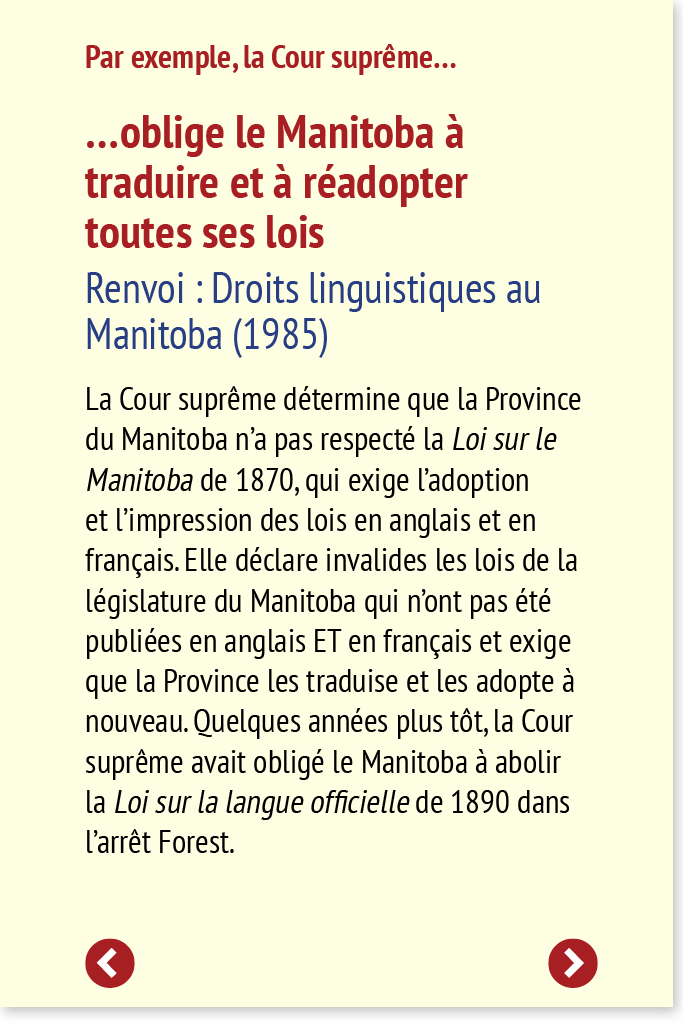 La Cour suprême détermine que la Province du Manitoba n’a pas respecté la Loi sur le Manitoba de 1870, qui exige l’adoption et l’impression des lois en anglais et en français. Elle déclare invalides les lois de la législature du Manitoba qui n’ont pas été publiées en anglais ET en français et exige que la Province les traduise et les adopte à nouveau. Quelques années plus tôt, la Cour suprême avait obligé le Manitoba à abolir la Loi sur la langue officielle de 1890 dans l’arrêt Forest.