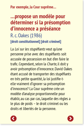 La Loi sur les stupéfiants veut qu’une personne prise avec des stupéfiants soit accusée de possession en but d’en faire le trafic. Cependant, selon la Charte, il doit y avoir présomption d’innocence. David Oakes étant accusé de transporter des stupéfiants en très petite quantité, la loi justifie-t-elle vraiment d’ignorer sa présomption d’innocence? La Cour suprême crée un modèle d’analyse proportionnelle pour établir, au cas par cas, laquelle des règles a le plus de poids – le droit criminel ou les droits et libertés de la personne.