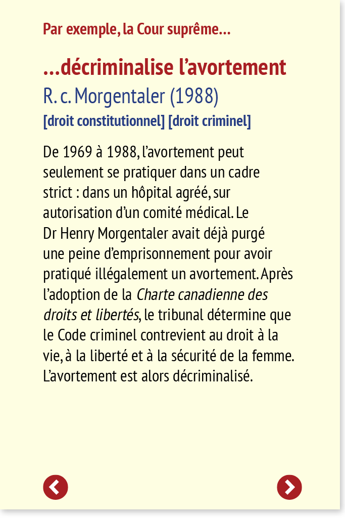 De 1969 à 1988, l’avortement peut seulement se pratiquer dans un cadre strict : dans un hôpital agréé, sur autorisation d’un comité médical. Le Dr Henry Morgentaler avait déjà purgé une peine d’emprisonnement pour avoir pratiqué illégalement un avortement. Après l’adoption de la Charte canadienne des droits et libertés, le tribunal détermine que le Code criminel contrevient au droit à la vie, à la liberté et à la sécurité de la femme. L’avortement est alors décriminalisé.