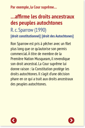 Ron Sparrow est pris à pêcher avec un filet plus long que ce qu’autorise son permis commercial. À titre de membre de la Première Nation Musqueam, il revendique son droit ancestral. La Cour suprême lui donne raison : la Constitution protège les droits autochtones. Il s’agit d’une décision phare en ce qui a trait aux droits ancestraux des peuples autochtones.