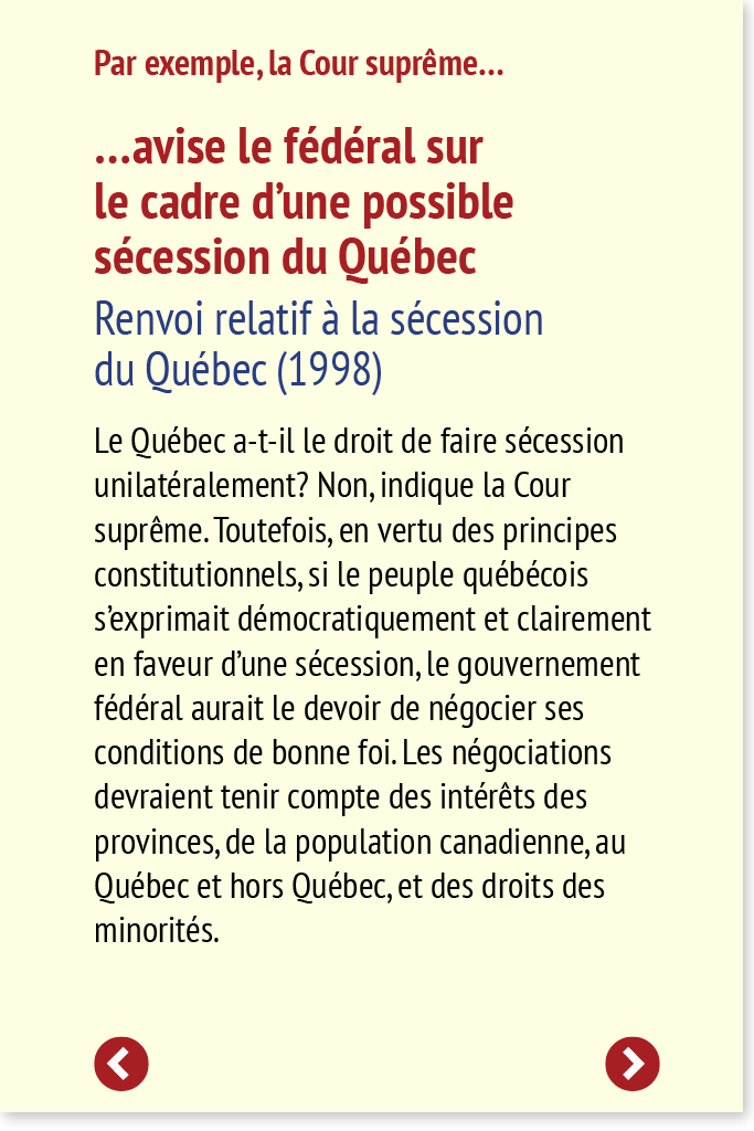 Le Québec a-t-il le droit de faire sécession unilatéralement? Non, indique la Cour suprême. Toutefois, en vertu des principes constitutionnels, si le peuple québécois s’exprimait démocratiquement et clairement en faveur d’une sécession, le gouvernement fédéral aurait le devoir de négocier ses conditions de bonne foi. Les négociations devraient tenir compte des intérêts des provinces, de la population canadienne, au Québec et hors Québec, et des droits des minorités.