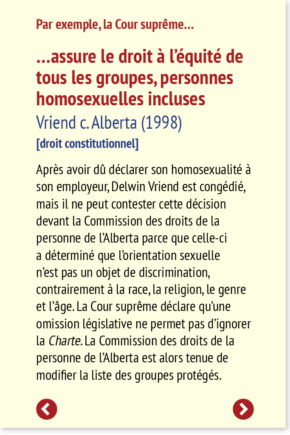 Après avoir dû déclarer son homosexualité à son employeur, Delwin Vriend est congédié, mais il ne peut contester cette décision devant la Commission des droits de la personne de l’Alberta parce que celle-ci a déterminé que l’orientation sexuelle n’est pas un objet de discrimination, contrairement à la race, la religion, le genre et l’âge. La Cour suprême déclare qu’une omission législative ne permet pas d’ignorer la Charte. La Commission des droits de la personne de l’Alberta est alors tenue de modifier la liste des groupes protégés.