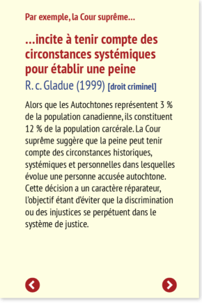 Alors que les Autochtones représentent 3 % de la population canadienne, ils constituent 12 % de la population carcérale. La Cour suprême suggère que la peine peut tenir compte des circonstances historiques, systémiques et personnelles dans lesquelles évolue une personne accusée autochtone. Cette décision a un caractère réparateur, l’objectif étant d’éviter que la discrimination ou des injustices se perpétuent dans le système de justice.