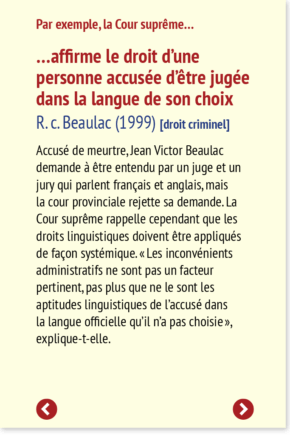 Accusé de meurtre, Jean Victor Beaulac demande à être entendu par un juge et un jury qui parlent français et anglais, mais la cour provinciale rejette sa demande. La Cour suprême rappelle cependant que les droits linguistiques doivent être appliqués de façon systémique. « Les inconvénients administratifs ne sont pas un facteur pertinent, pas plus que ne le sont les aptitudes linguistiques de l’accusé dans la langue officielle qu’il n’a pas choisie », explique-t-elle.