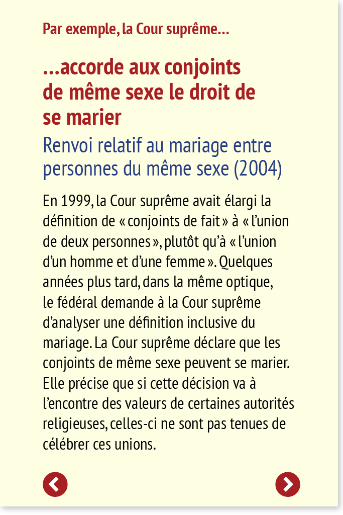 En 1999, la Cour suprême avait élargi la définition de « conjoints de fait » à « l’union de deux personnes », plutôt qu’à « l’union d’un homme et d’une femme ». Quelques années plus tard, dans la même optique, le fédéral demande à la Cour suprême d’analyser une définition inclusive du mariage. La Cour suprême déclare que les conjoints de même sexe peuvent se marier. Elle précise que si cette décision va à l’encontre des valeurs de certaines autorités religieuses, celles-ci ne sont pas tenues de célébrer ces unions.
