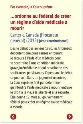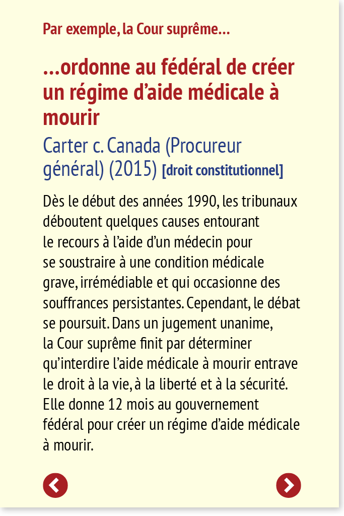 Dès le début des années 1990, les tribunaux déboutent quelques causes entourant le recours à l’aide d’un médecin pour se soustraire à une condition médicale grave, irrémédiable et qui occasionne des souffrances persistantes. Cependant, le débat se poursuit. Dans un jugement unanime, la Cour suprême finit par déterminer qu’interdire l’aide médicale à mourir entrave le droit à la vie, à la liberté et à la sécurité. Elle donne 12 mois au gouvernement fédéral pour créer un régime d’aide médicale à mourir.