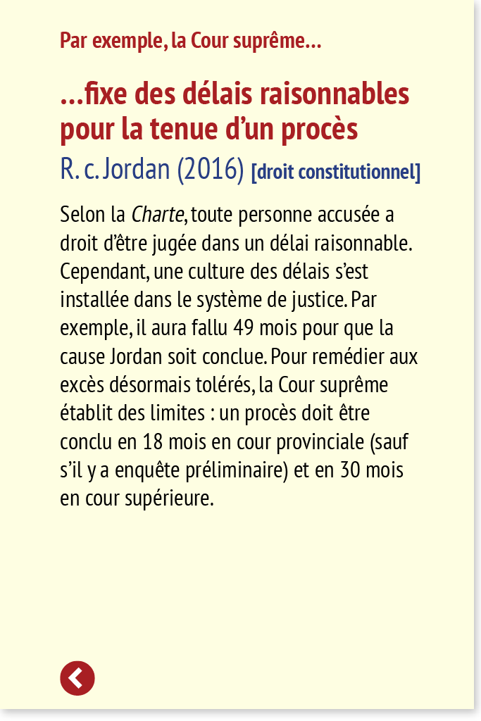 Selon la Charte, toute personne accusée a droit d’être jugée dans un délai raisonnable. Cependant, une culture des délais s’est installée dans le système de justice. Par exemple, il aura fallu 49 mois pour que la cause Jordan soit conclue. Pour remédier aux excès désormais tolérés, la Cour suprême établit des limites : un procès doit être conclu en 18 mois en cour provinciale (sauf s’il y a enquête préliminaire) et en 30 mois en cour supérieure.