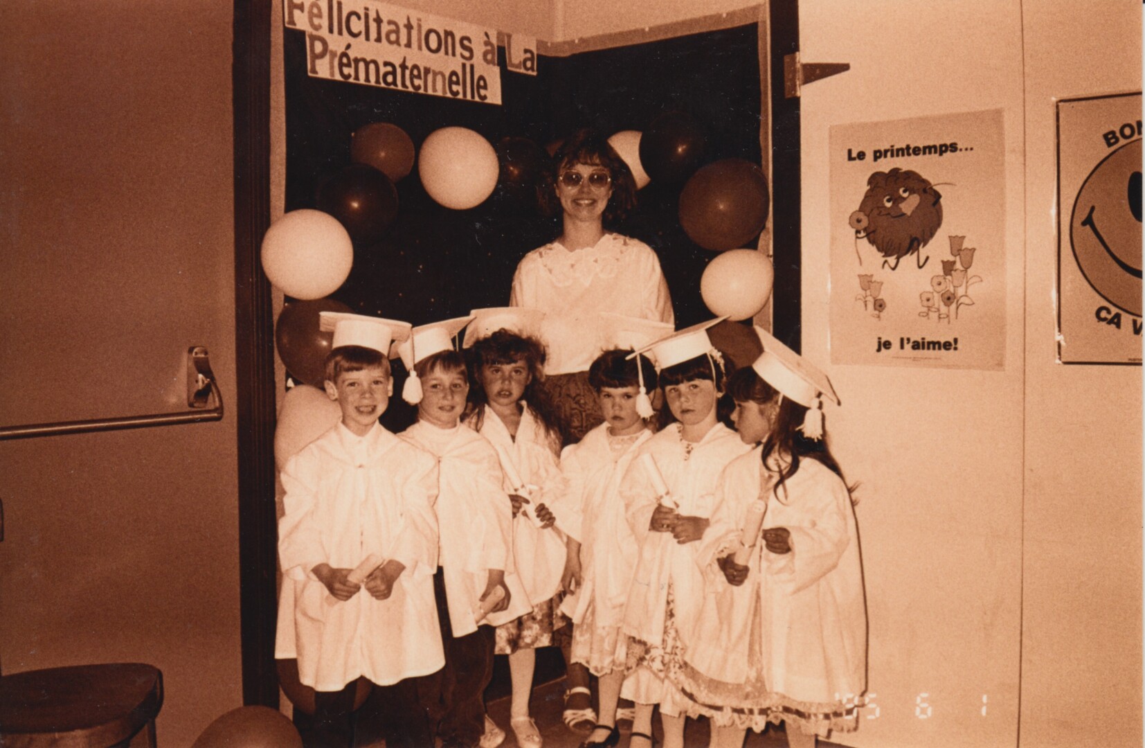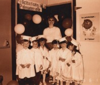 53 – Les communautés francophones de la péninsule de Port-au Port ont lutté pendant plusieurs années pour obtenir le droit d’une scolarité en français à Terre-Neuve-et-Labrador. L’enseignante dans cette photo, prise avec les élèves finissants de la prématernelle en 1995, représente l’importance d’une éducation en français pour cette population. Quel est son nom? Dans quelle école a-t-elle enseigné?