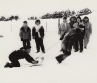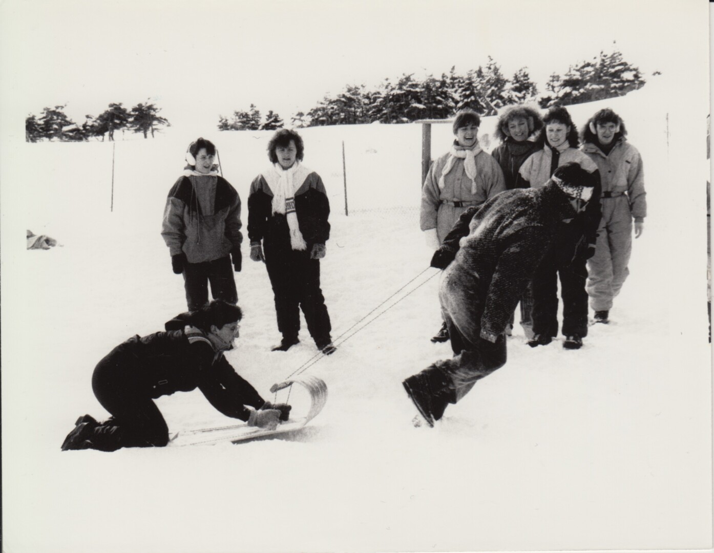 58 – Une course à traîneaux lors du Carnaval d’hiver de 1990, à Cap-Saint-Georges. D’autres activités en plein air communes étaient la coupe de bûches et les courses en sac. Qui sont les personnes présentes sur cette photo?