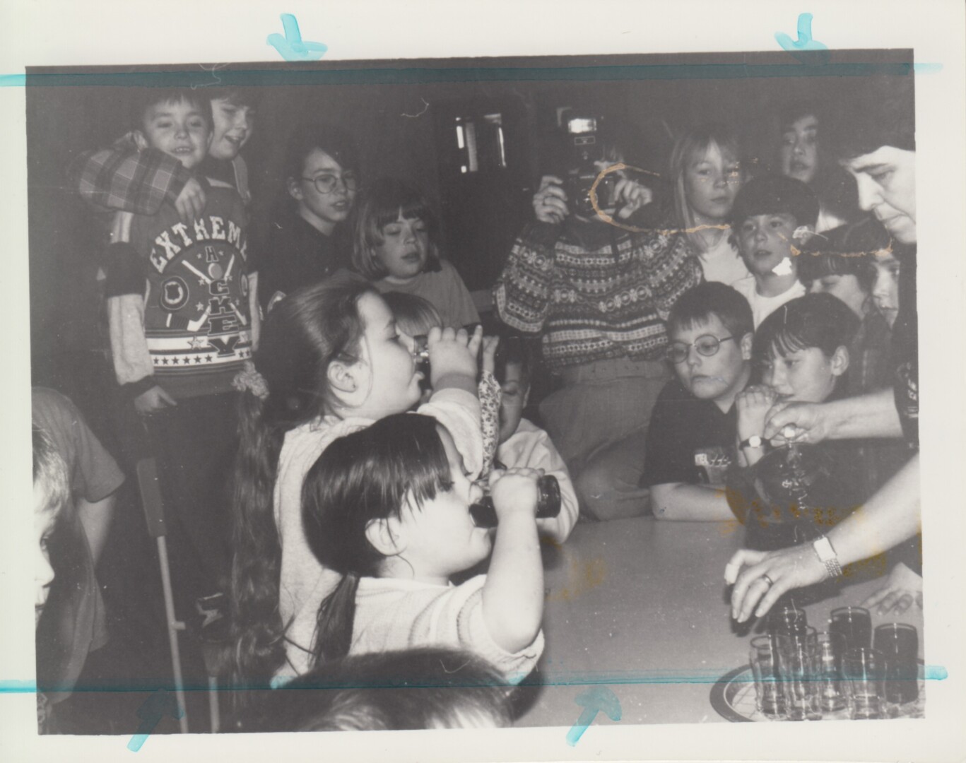 56 – Une activité bien reportée dans les anciennes publications du Gaboteur était le «Chug-a-lug», lors de laquelle on gagne en buvant rapidement sa boisson. Cette photo date du Carnaval d’hiver de 1996, à La Grand’Terre, organisé par l’Héritage de l’île Rouge. Qui sont les personnes présentes sur cette photo?