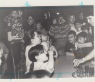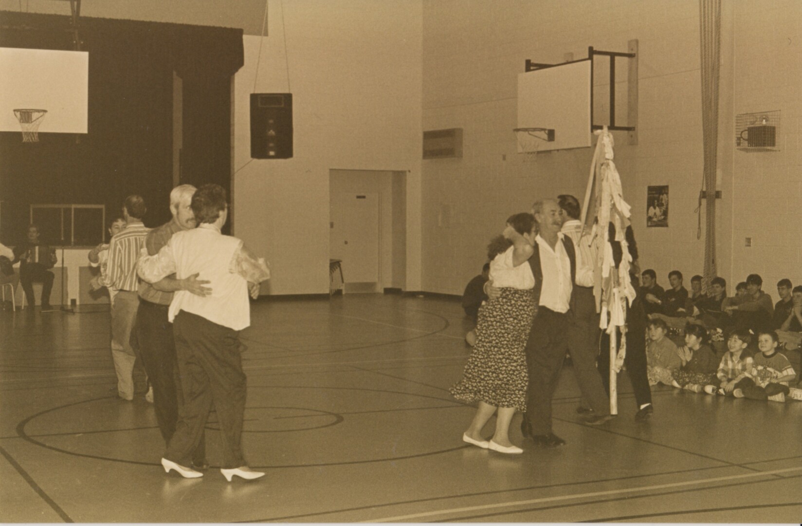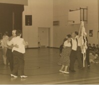 55 – On a pris cette photo en plein milieu de la Danse de la Chandeleur, en février 1996. La danse a eu lieu dans le gymnase du Centre scolaire et communautaire Sainte-Anne, à La Grand’Terre. Reconnaissez-vous les couples qui dansent? Sinon, les élèves qui regardent le spectacle? Qui aurait pu être le ou la photographe?