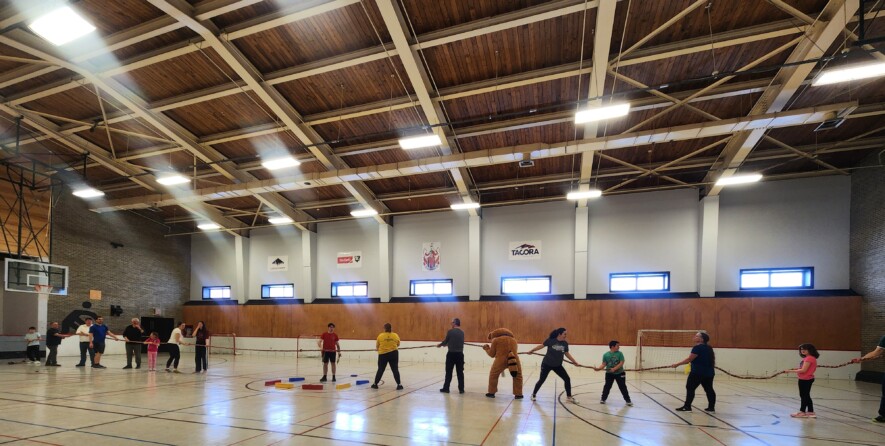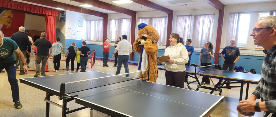 Les Jeux franco-labradoriens commencent avec un petit souper et une compétition de fléchettes au Légion de Labrador City. Le lendemain, on se retrouve à l’École l’ENVOL pour un tournoi féroce de ping-pong. Tout à droite de la photo, vous pouvez voir le consul de France à Moncton, Bertrand Cahuet, en pleine participation. En plein milieu de la photo: Rigolo le raton laveur, la mascotte spectaculaire de l’Association Francophone du Labrador.